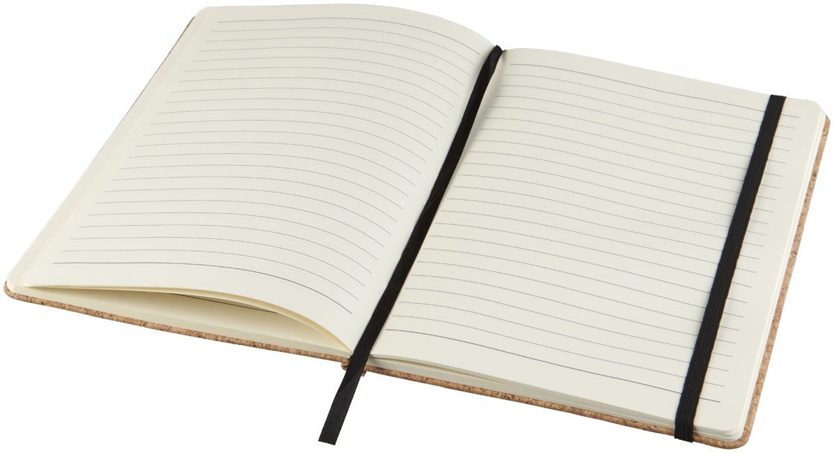 Carnet de notes de taille A5 avec couverture en liège, élastique et ruban noirs.