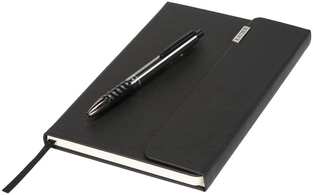 ruban marque-pages noir, fermeture magnétique et 80 feuilles (80 g/m2) de papier crème ligné.