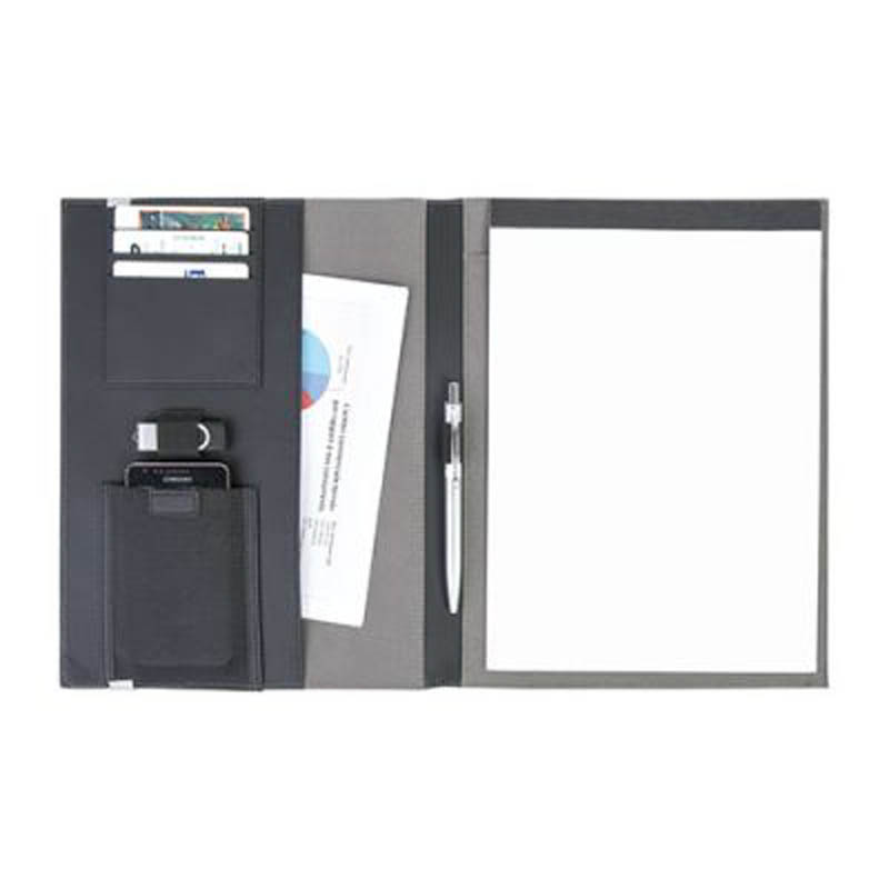 Conférencier A4. Bloc 25 pages inclus. Poche intérieure élastiquée 10 x 12,5 cm. Stylo et accessoires non fournis
