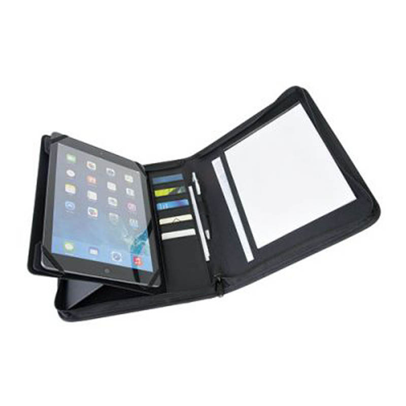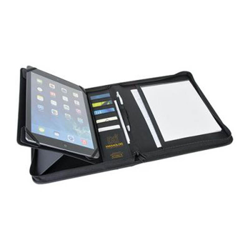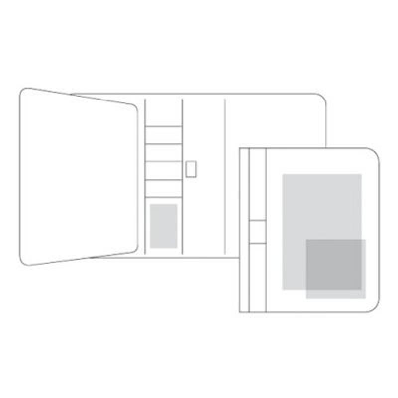Conférencier avec support inclinable et passants élastiqués amovibles permettant de fixer tablettes ou smartphones de tailles différentes (taille maxi 19 x 24,5 cm ou 9,7 pouces). 1 passant élastiqué à l’extérieur. Bloc A5 non ligné 25 feuilles.