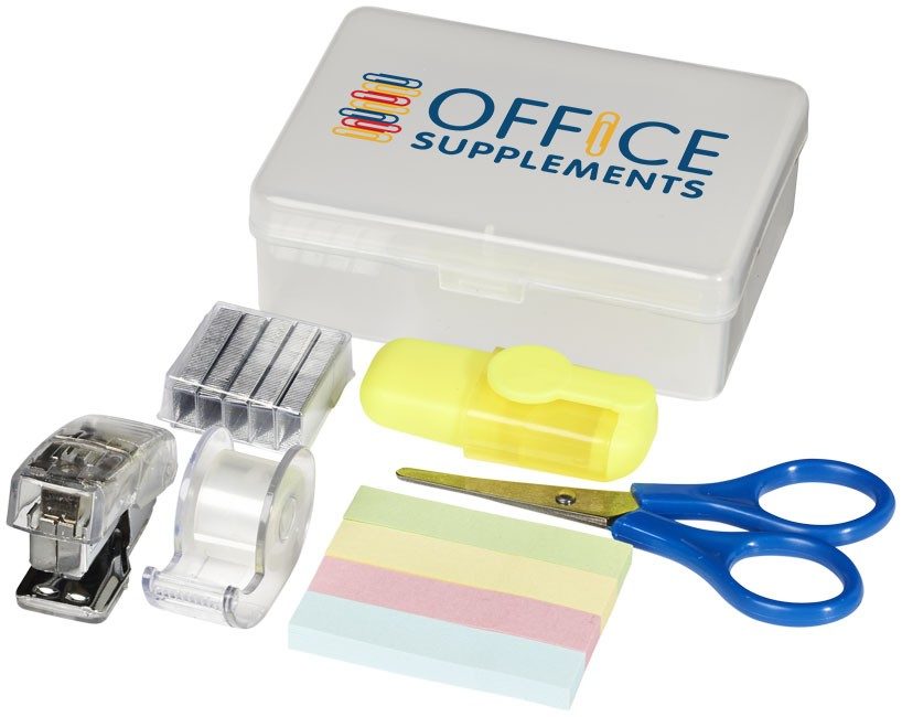 Kit de papeterie contenant des feuillets repositionnables, des ciseaux, une agrafeuse et ses agrafes, du ruban adhésif et des surligneurs.