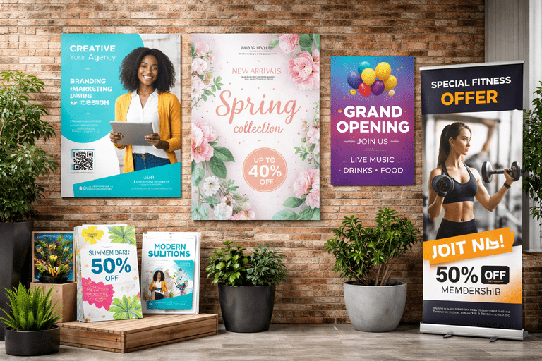 Les plus courants sont les flyers, brochures, cartes de visite, affiches, kakémonos, stickers et PLV.