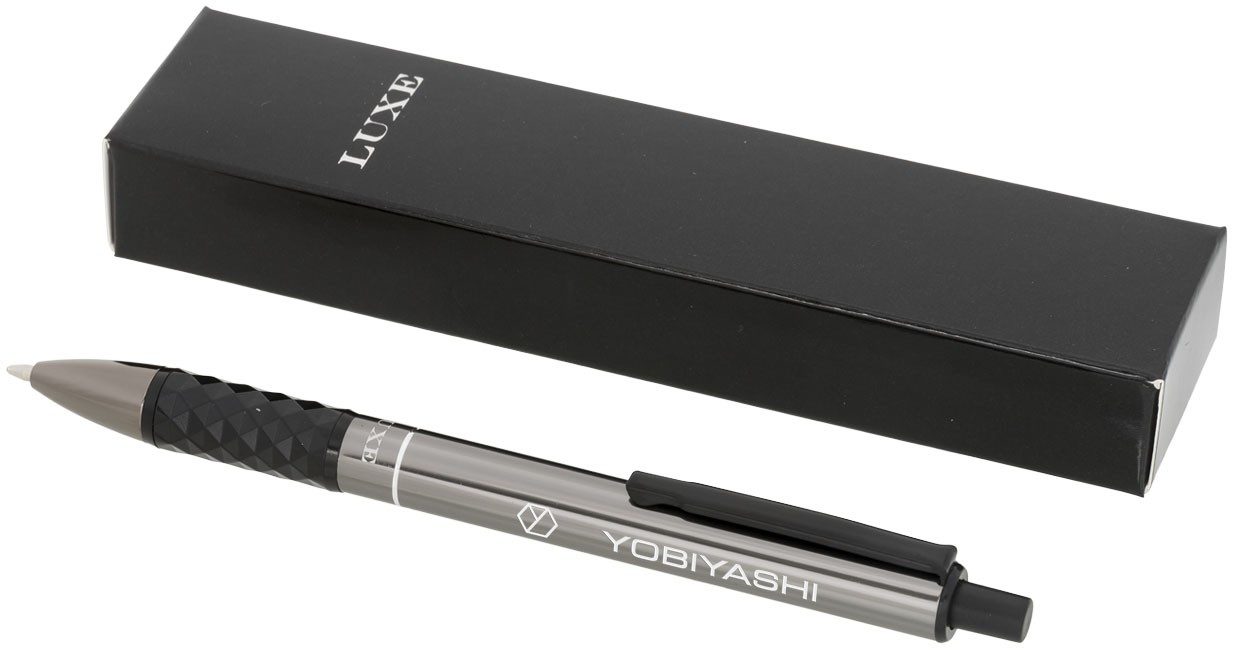Avec recharge d’encre noire de qualité supérieure pour stylo roller et présentation dans une boîte cadeau «  LUXE » (17×3,5×2 cm).