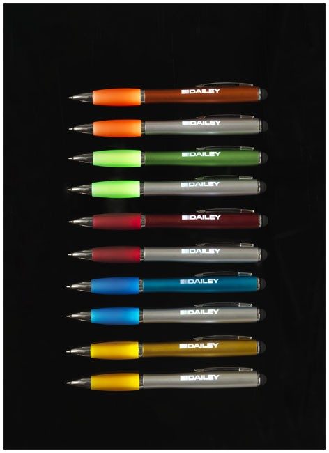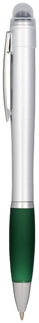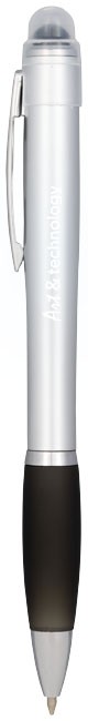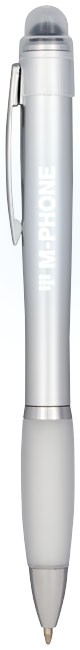 Stylo à bille avec mécanisme twist et grip doux au toucher. Lorsque le stylo est gravé le logo s’allume en appuyant sur le stylet.