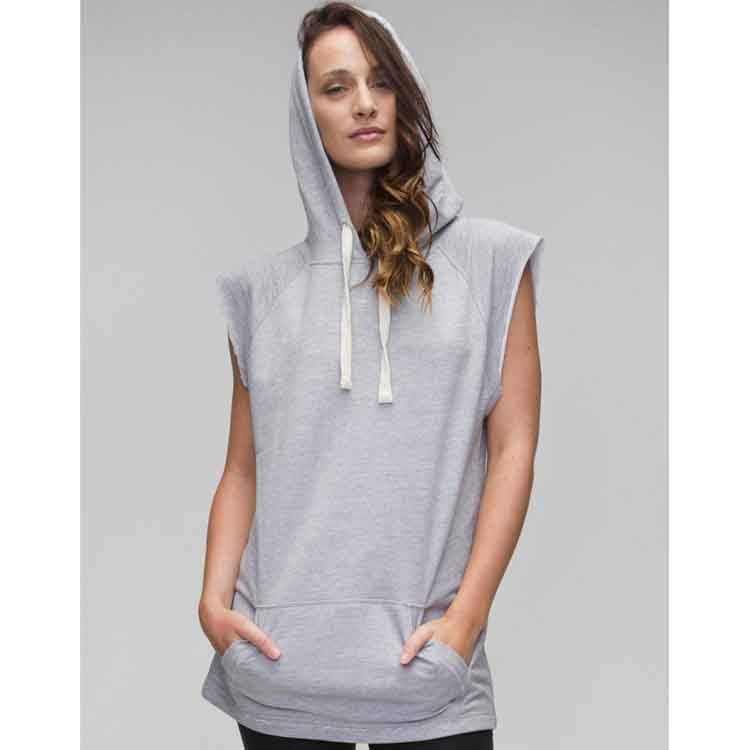Un sweat avec capuche, mais sans manches, c’est tout à fait possible ! Nous vous proposons le Sweat shirt femme sans manches. Actuellement, en vogue, ce type de sweat séduit de plus en plus bon nombre de femmes. Il est pratiquement léger pour un sweat, et très confortable. Porté en été, il vous protégera des rayons du soleil. Porté en hiver, il vous couvrira bien au chaud. Sa capuche est suffisamment large pour contenir toute votre tête. Néanmoins, elle n’est pas doublée, mais permet en tout cas de garder votre température stable. Avec le Sweat shirt femme sans manches, vous disposez également d’une poche kangourou à bord brut et d’un cordon naturel. La base est dotée d’un bord brut et d’une piqûre permettant d’éviter les effilochages.